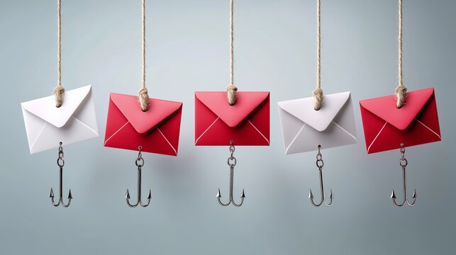 Phishing email envelopes with hooks symbolizing cybercrime fraud online scams digital deception and social engineering security threats, Generative AI