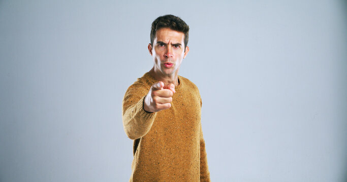 Index finger pointing at you, choosing, picking gesture, isolated on white background.
