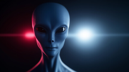 Close-up of mysterious alien face with detailed extraterrestrial features and intense gaze.