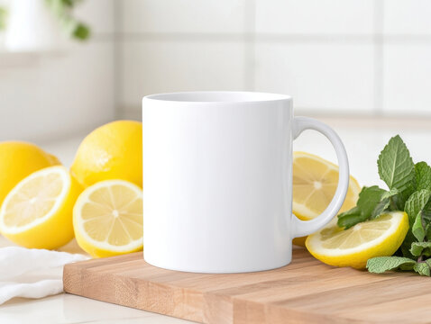 blank white mug surrounded by fresh lemons and mint leaves on wooden cutting board, creating bright and refreshing kitchen scene. Perfect for showcasing beverage ideas