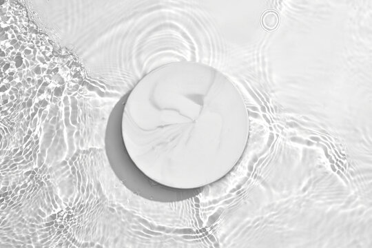 White circle podium on transparent clear water texture with splashes and waves in sunlight. Blank space for product promotion