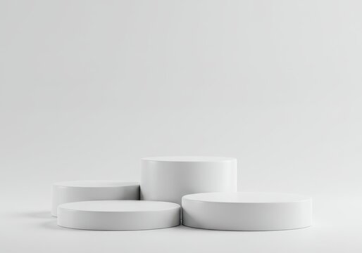 Four white cylinder podiums arranged in a staggered display against a clean, bright white background for product presentation
