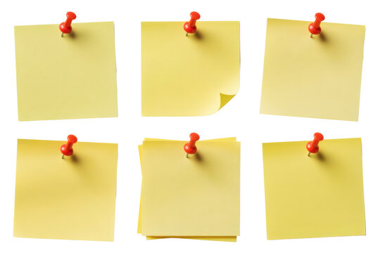 Six blank yellow sticky notes with red pushpins, perfect for reminders, ideas, or planning your next big project.