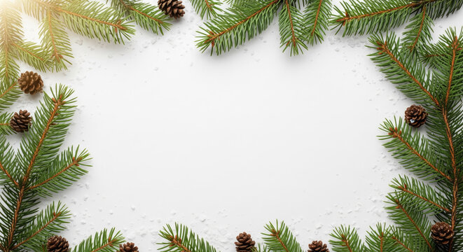 Blank white card surrounded by frosted pine branches and pinecones on a white background