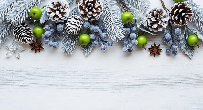 Christmas border with frosted fir branches, pine cones, and festive berries on a light wooden background.