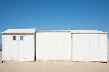 white beach houses, cabines in Blankenberg, Belgium, against blue sky