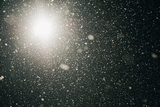 Countless snowflakes drift by at night, captured in midair and illuminated by a bright street lamp, creating a sparkling and atmospheric winter scene.
