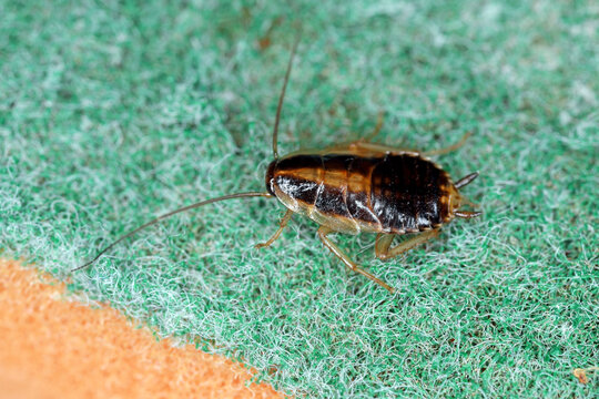 German Cockroach (Blattella germanica) insect on leaf, nature pest control fumigation Springtime.