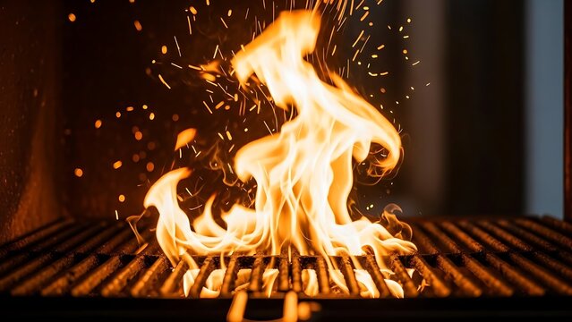 Vibrant flames engulf grill grates in a fiery blaze
