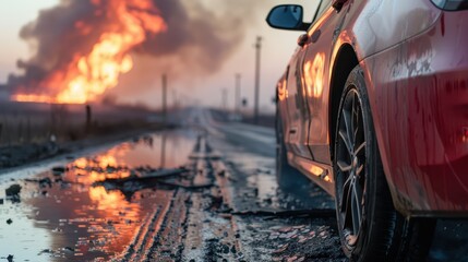 A dramatic scene with a car on a muddy road and a massive explosion blazing in the background, showcasing chaos and tension in visually striking imagery.