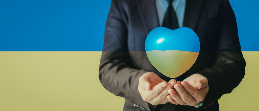 Heart with print the national flag of ukraine in hands, Copy space. stop the war and peace in Ukraine, freedom for Ukraine,