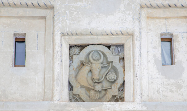 The stone sculpture with an ox head on the wall of the Putna monastery - Romania. In the past it represented the emblem of Moldova