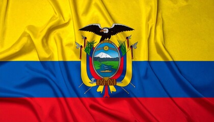 Ecuadorian flag with detailed coat of arms on yellow, blue, red stripes