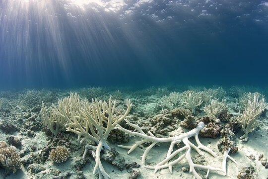 Underwater landscape with bleached coral reefs, as sunlight filters through clear waters, revealing the devastation of coral bleaching impacting the fragile marine ecosystem.