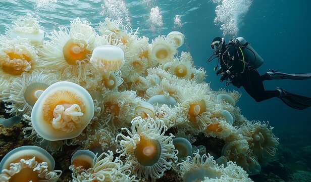 Enigmatic jellyfish and luminous coral in mysterious underwater realm