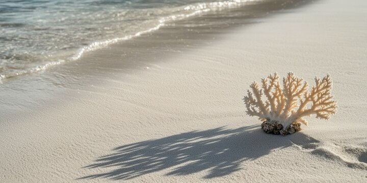 A piece of bleached coral lying on a tropical beach, with footprints in the sand nearby