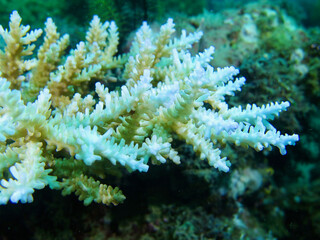 Dead Acropora hard corals in a shallow reef Raja Ampat Indonesia.