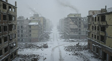 Apocalyptic urban decay with dilapidated buildings and polluted canal