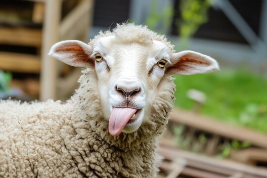 Sheep sticking out tongue funny animal farm mammal woolly white cute.