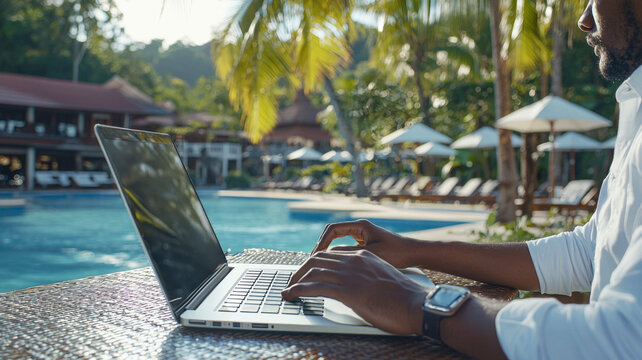 Bleisure work relaxation. A person works on a laptop by a poolside, surrounded by palm trees and lounge chairs, capturing a serene tropical vibe.
