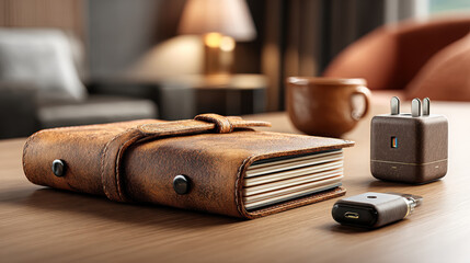 Luxury bleisure resort leather notebook travel journal on wooden table with coffee and charger creating cozy productive mood
