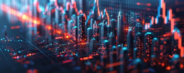 Dynamic financial data visualization showcasing bright graphs and towering cityscape elements blending technology with finance.