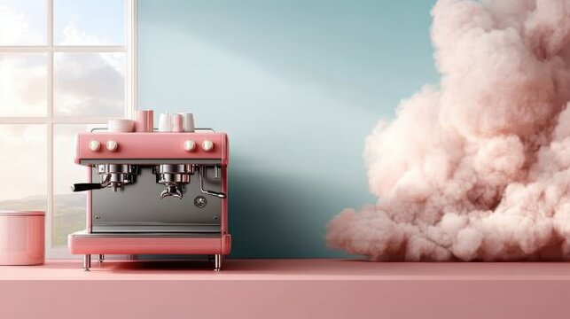 A stylish pink espresso machine stands on a counter surrounded by pastel hues and fluffy pink clouds, blending everyday utility with a whimsical, serene aesthetic.