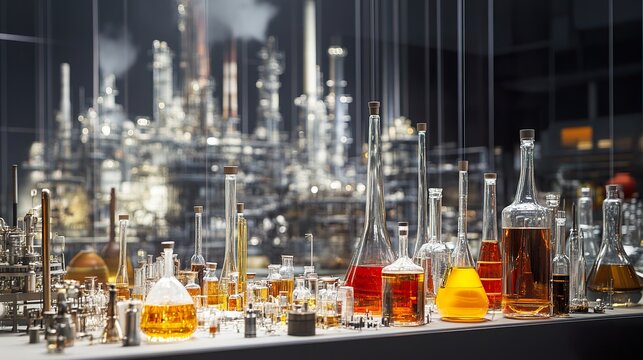 A display of various petroleum products, from gasoline and diesel to plastics and lubricants, with factories and refineries in the background