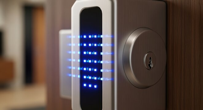Closeup of LED indicators blinking on a smart deadbolt lock during the pairing process reflecting technology in action and user feedback.