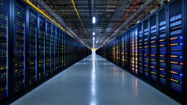 A long corridor in a modern data center lined with server racks, blinking LED lights, and futuristic ambiance, horizontal composition.