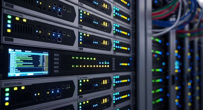 Modern server room technology with blinking lights and connected cables for data center operations