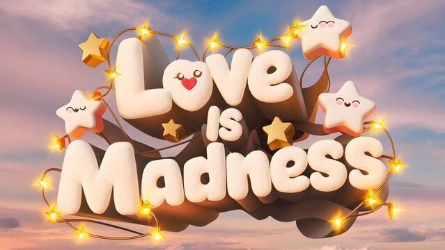 Playful 3D Render Illustration Featuring "Love is Madness" in Cloud-Like Typography with Kawaii Stars and Blinking Lights on a Warm Pastel Sky Background