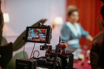 Film set, monitors and modern shooting equipment. Film crew, lighting devices, monitors, playbacks - filming equipment and a team of specialists in filming movies, advertising and TV series