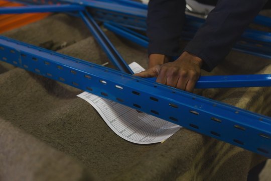 Warehouse worker checking inventory on tablet amid stacked boxes and pallets for logistics