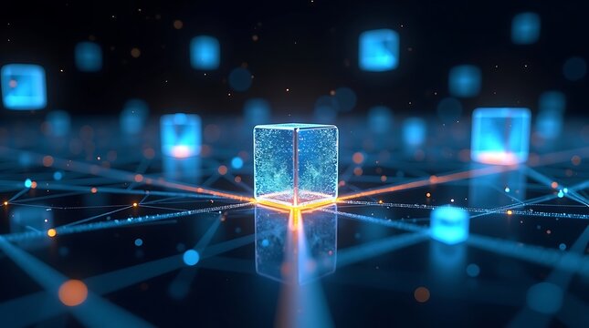 Abstract visuals of blockchain technology in business, featuring interconnected digital blocks and data nodes in a digital security features