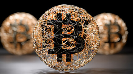 Wireframe spheres with Bitcoin symbols, illuminated against dark background