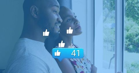 Couple balancing morning routine with stock market data overlay and financial graphs