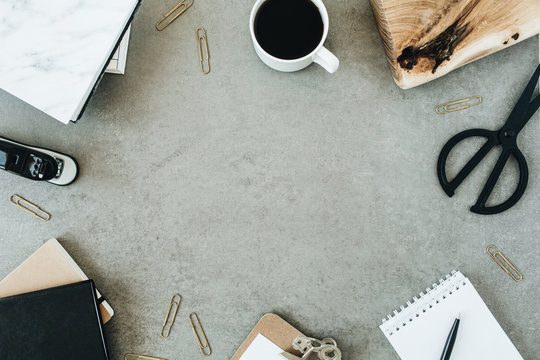 Flatlay mockup of workspace frame on grey background. Flat lay, top view.