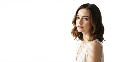 Pensive woman portrait. Studio shot. Elegant top. Natural light. Use beauty blog