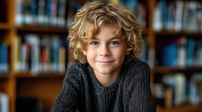 Portrait d'un jeune garçon souriant aux cheveux blonds bouclés portant un pull gris foncé, assis dans une bibliothèque avec des livres flous en arrière-plan.