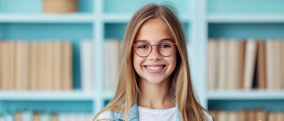 A young girl in glasses smiles at the camera, framed by bookshelves behind her