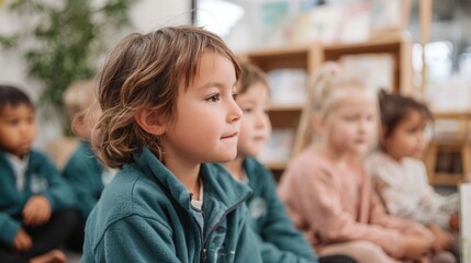 A young boy with blonde hair reading a book in front of bookshelves, AI