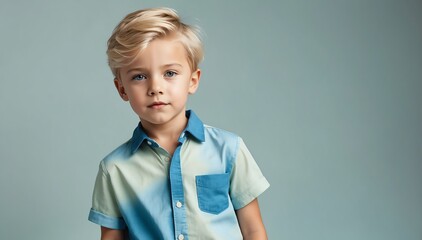 handsome kid blonde boy on summer outfit fashion style on plain bright studio background