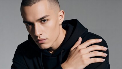 A young man with a buzz cut, wearing a black leather jacket, stares intensely into the camera against a warm orange backdrop. The mood is edgy and mysterious.