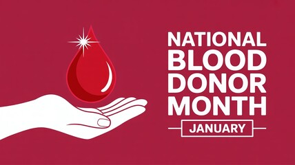 January is National Blood Donor Month Banner featuring a White Hand Holding a Red Blood Drop Icon on a Bold, Gradient Red Background.