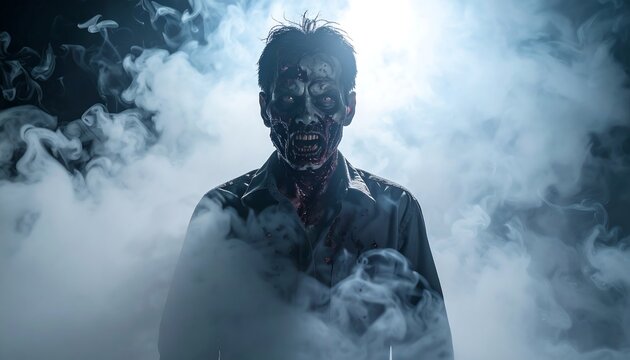 Undead creature emerges from smoke. Horrifying face, bloodied shirt, glowing eyes in a dark, hazy setting