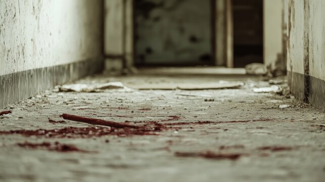crime scene in abandoned warehouse with bloodstain on floor, illuminated by sunlight streaming through broken windows, creating haunting atmosphere