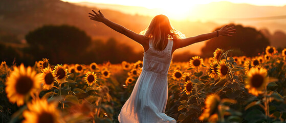 Happy young woman in a white summer dress spread her arms towards the sunset in a field with sunflowers, summer time, happiness, freedom concept