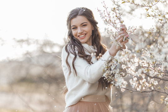 Pretty smiling teen girl are posing in garden near blossom cherry tree with white flowers. Spring time