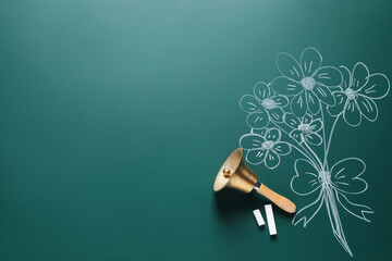Golden bell, pieces of chalk and drawn flowers on green board, flat lay. School time
